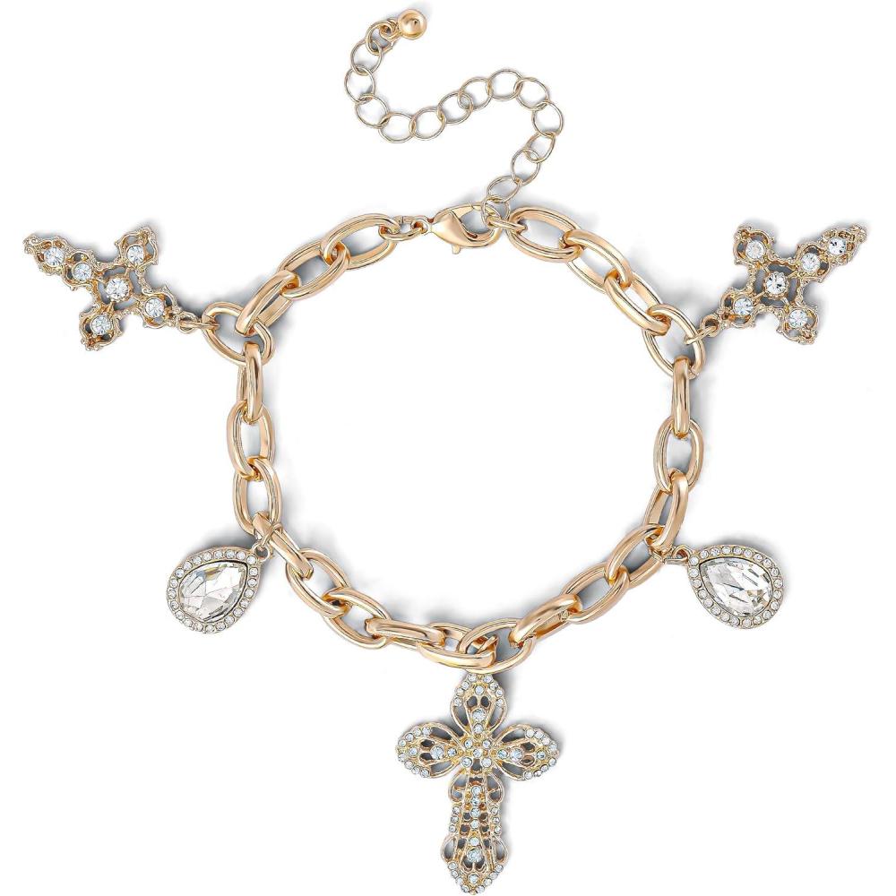 Jessica Simpson Gold-Tone Charm Bracelet for Women Adjustable, Chunky Bracelet with 7 Charms(Cross Gold Tone)