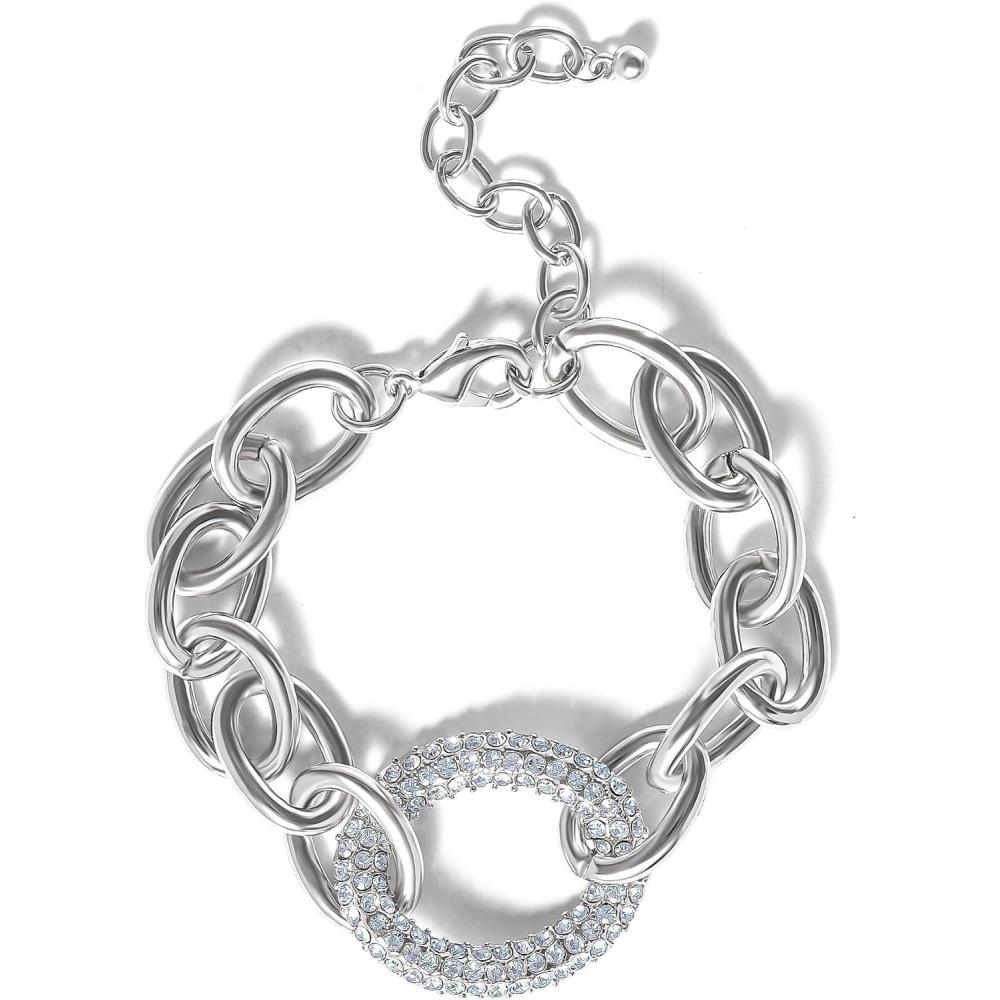 Jessica Simpson Silver-Tone Chain Link Bracelet – Statement Jewelry with Pavé Crystal Accent – Adjustable Chunky Bracelet for Women