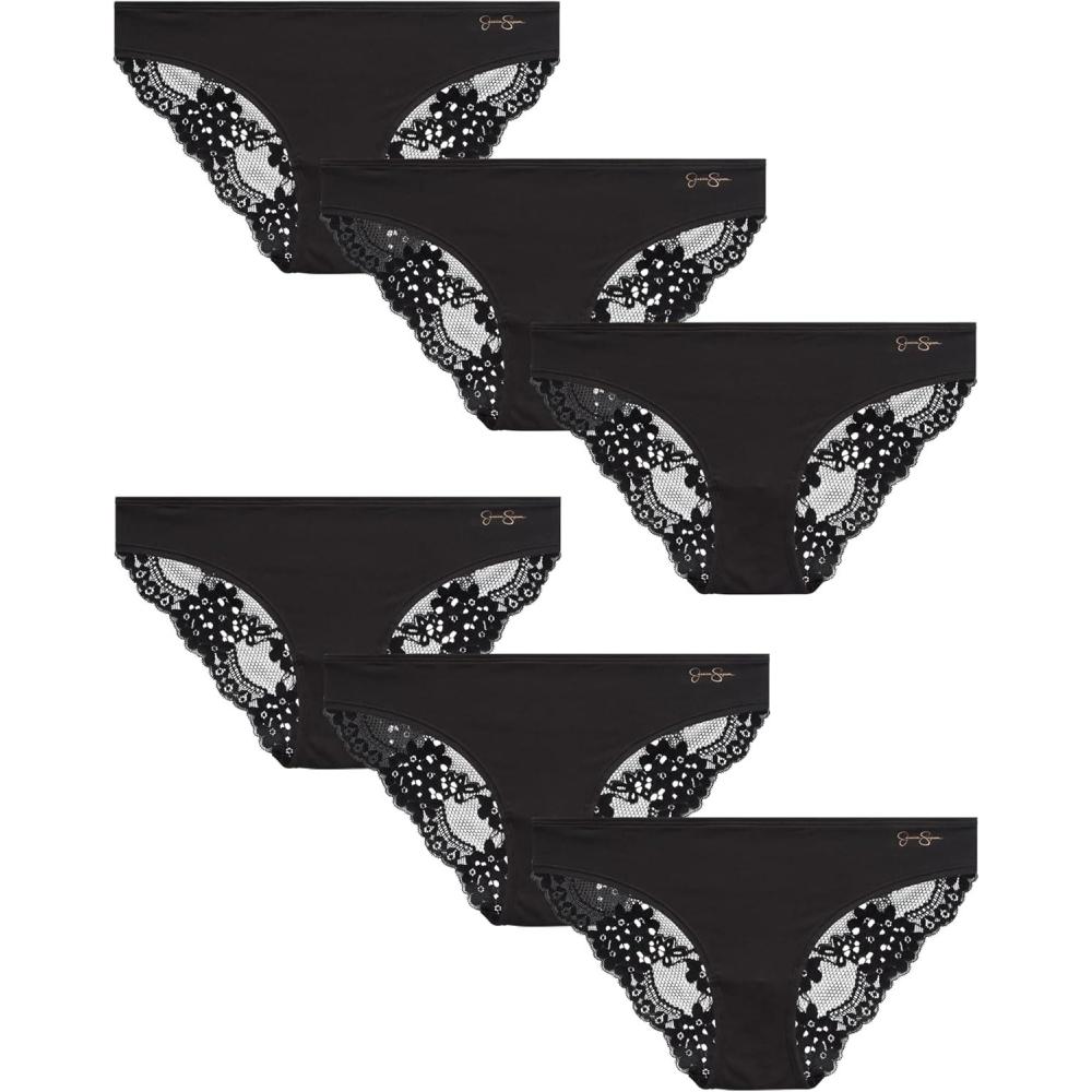 Jessica Simpson Women’s Bikini Panties – 6 Pack Seamless Lace Womens Underwear – Microfiber Bikinis for Women (Sizes: S-XL)(Black)