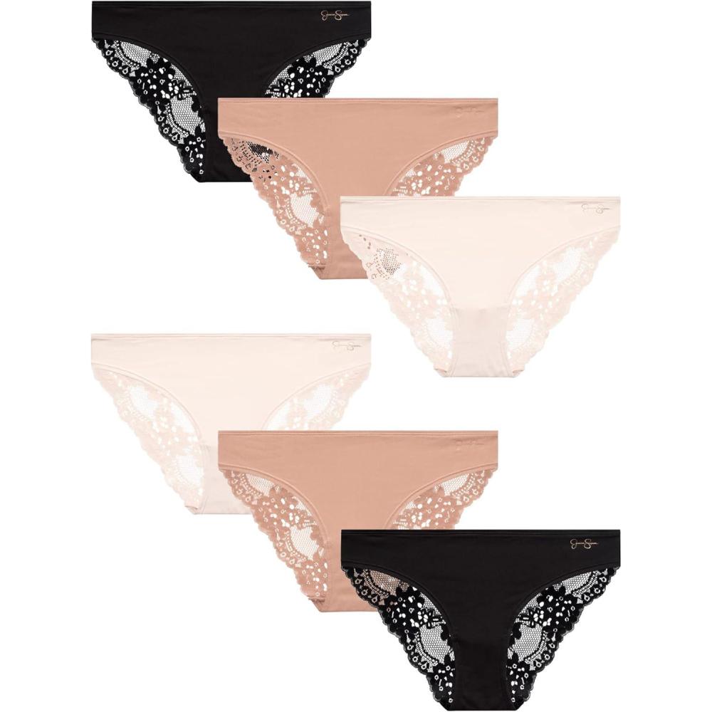 Jessica Simpson Women’s Bikini Panties – 6 Pack Seamless Lace Womens Underwear – Microfiber Bikinis for Women (Sizes: S-XL)(Pearl/Dolce/Black)